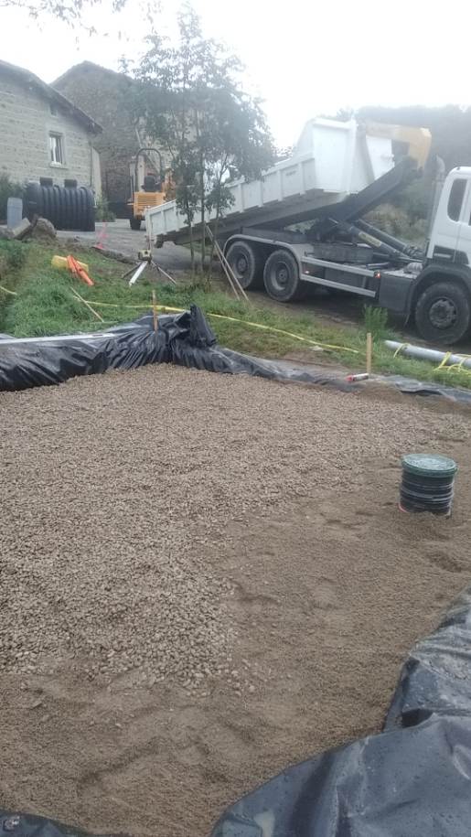 Cette installation nécessitera l'intervention d'une équipe de 2 personnes composée d'un canalisateur et d'un pelleteur, avec comme principal matériel, une pelle à chenille. Dans un premier temps, on repère les réseaux d'eaux usées afin de déterminer la position la plus adéquate pour le système de traitement. Ensuite, on terrasse pour mettre en place les éléments et on raccorde aux canalisations de l'habitation. Pendant que le système est encore visible, nous faisons passer un contrôleur du service public local d'assainissement non collectif afin qu'il vérifie la conformité de l'ouvrage et délivre un document l'attestant. C'est ce même service local qui fera une visite tous les 7 ans pour vérifier la conformité du système.